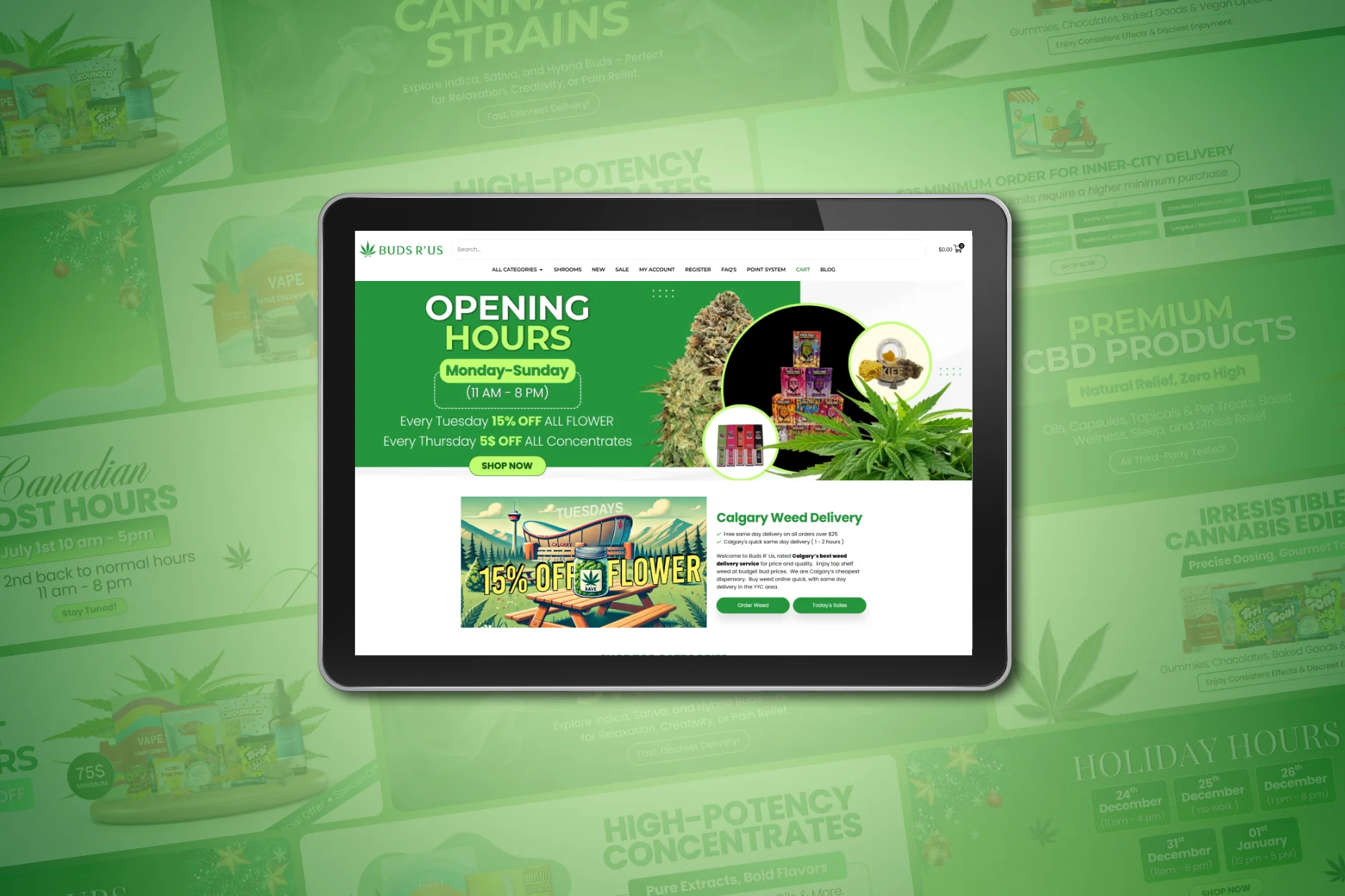 Custom website banners designed to highlight product categories, promotions, and brand messaging for an online cannabis store.