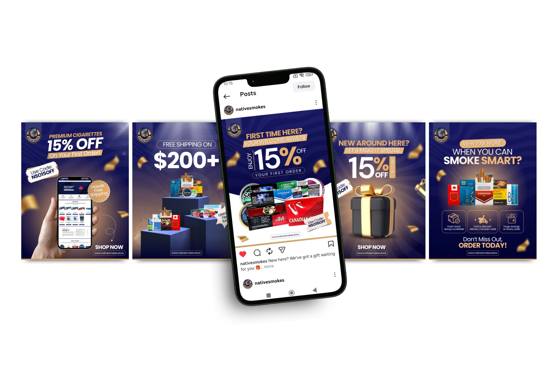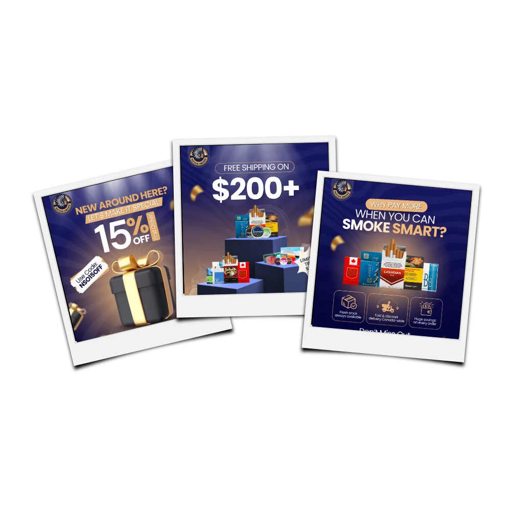 Native Smokes Delivered is an online Canadian retailer offering a range of products that include native cigarettes, nicotine pouches, cigars, chewing tobacco, nicotine vape products, and related items, all available for delivery across Canada. The platform aims to provide convenience, variety, and competitive pricing to customers seeking these products in a digital shopping experience. The objective of this social media design project was to craft compelling visual content that reflects the brand’s contemporary eCommerce identity while supporting promotional campaigns, product highlights, and customer engagement across Instagram and Facebook.